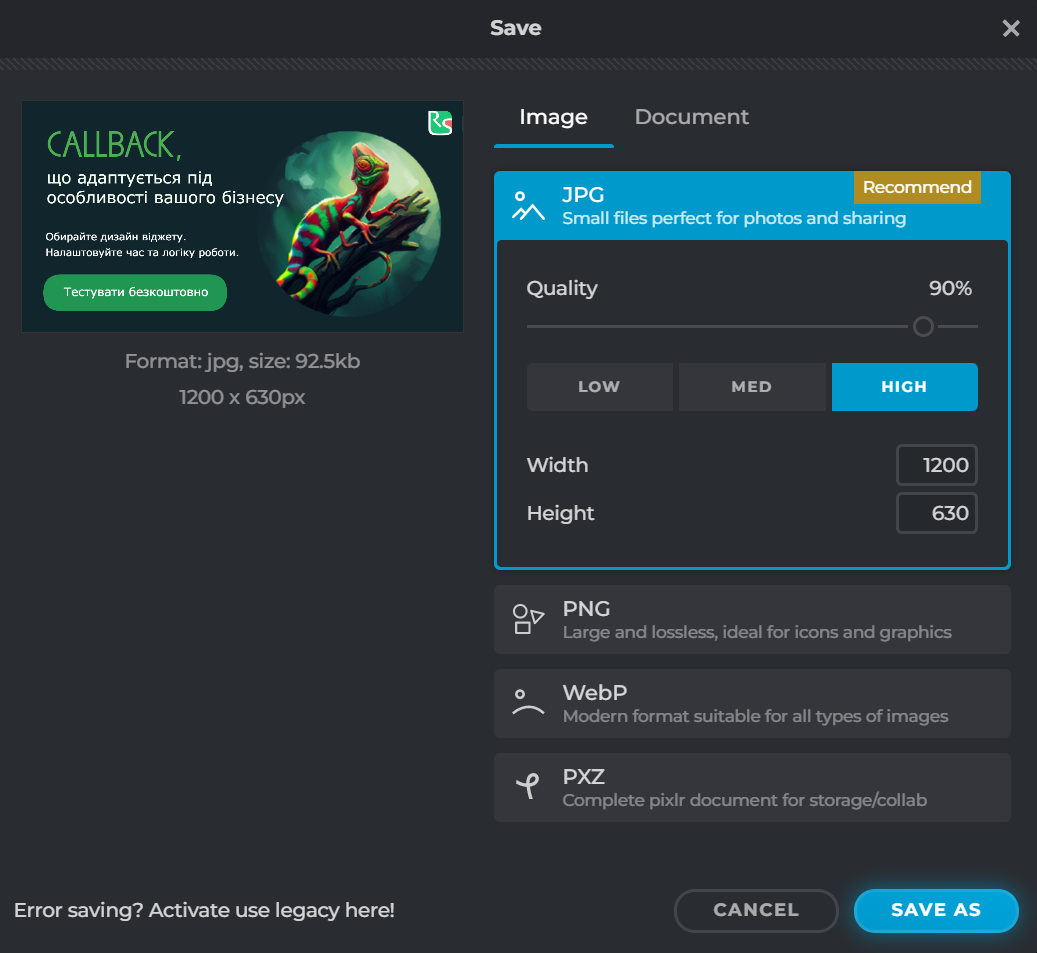 Należy pamiętać, że format można wybrać tylko dla wygenerowanego obrazu, a nie dla całego banera. W darmowej wersji Canva można tworzyć tylko kwadratowe banery.
